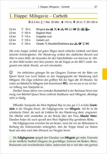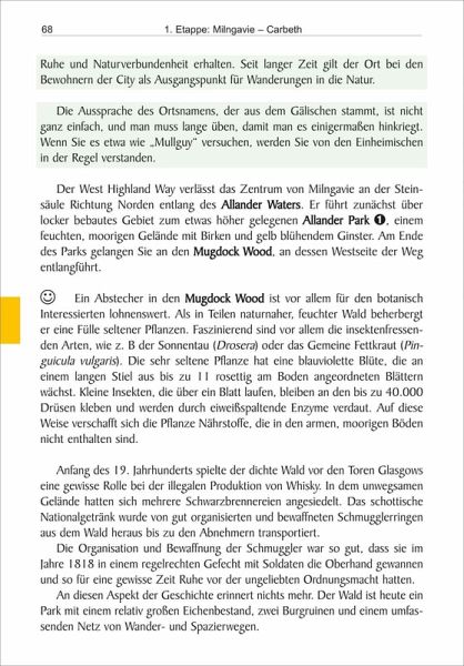 Der West Highland Way ist der schönste Langstreckenwanderweg Schottlands. 155 km führt er durch raues und zerklüftetes Gelände des südlichen und zentralen Hochlands. Es ist eine fantastische, aber streckenweise anstrengende Wanderung. Die Tour wird in 14 Einzeletappen beschrieben, sodass auch Wanderer, die nicht die ganze Strecke laufen wollen, gute Ein- bzw. Ausstiegsmöglichkeiten haben. Jede Etappenbeschreibung umfasst den Wegverlauf, wichtige Tipps wie Übernachtungsmöglichkeiten, Verkehrsverbindungen usw., Informationen zu wichtigen Aspekten von Natur, Landschaft, Kultur und Geschichte sowie eine Beschreibung lohnender Abstecher zu Zielen, die nicht direkt am Weg liegen.