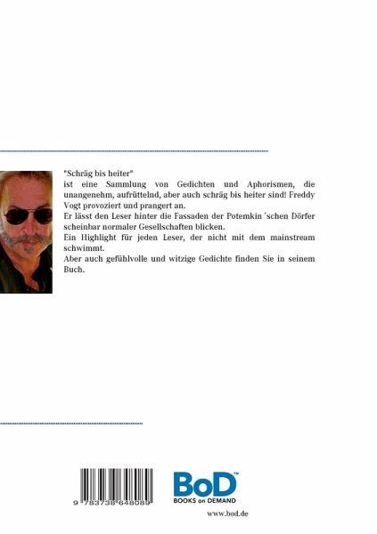 "Schräg bis heiter" ist eine Sammlung von Gedichten und Aphorismen, die unangenehm, aufrüttelnd, aber auch schräg bis heiter sind! Freddy Vogt provoziert und prangert an.Er lässt den Leser hinter die Fassaden der Potemkin'schen Dörfer scheinbar normaler Gesellschaften blicken. Ein Highlight für jeden Leser, der nicht mit dem Mainstream schwimmt. Der Autor ist sich darüber bewusst, dass er sich mit diesem Buch nicht nur Freunde macht.Aber auch seine gefühlvolle und witzige Seite kommt nicht zu kurz.