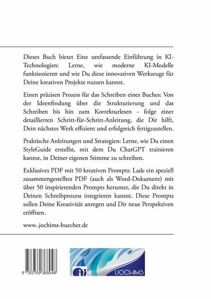 Dieses Buch bietet: Eine umfassende Einführung in KI-Technologien: Lerne, wie moderne KI-Modelle funktionieren und wie Du diese innovativen Werkzeuge für Deine kreativen Projekte nutzen kannst. Einen präzisen Prozess für das Schreiben eines Buches: Von der Ideenfindung über die Strukturierung und das Schreiben bis hin zum Lektorat - folge einer detaillierten Schritt-für-Schritt-Anleitung, die Dir hilft, Dein nächstes Werk effizient und erfolgreich fertigzustellen. Praktische Anleitungen und Strategien: Lerne, wie Du einen sogenannten StyleGuide erstellst, mit dem Du ChatGPT trainieren kannst, in Deiner eigenen Stimme zu schreiben. Exklusives PDF mit 50 kreativen Prompts: Lade ein speziell zusammengestelltes PDF (auch als Word-Dokument) mit mehr als 50 inspirierenden Prompts herunter, die Du direkt in Deinen Schreibprozess integrieren kannst. Diese Prompts sollen Deine Kreativität anregen und Dir neue Perspektiven eröffnen. www..jochims-buecher.de
