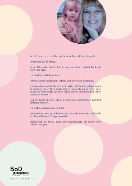 Auf dich warten 20 zielführende Schritte bis zu deiner Biografie.Dein Leben auf 80 Seiten.Deine Pilgerreise durch dein Leben von deiner Geburt bis heute wartet auf dich.Ich bin deine Reisebegleiterin.Du wirst deine Fähigkeiten, Talente und Interessen ausgraben.Ich habe diese 20 Schritte in eine Struktur mit Routine gefasst, damit du während deiner Reise zu dir und zu deinem Leben in einem Buch als netten Nebeneffekt das süße Leben spüren und in deinem Leben verankern kannst. Am Ziel hältst du dein Leben in einem Buch professionell gedruckt in deinen Händen.Ich begleite dich dabei persönlich.Du bekommst von mir feierlich eine Urkunde überreicht, sobald du da oben auf deinem Treppchen stehst.Gleichzeitig ist dieses Buch eine Eintrittskarte für meine zwei Online-Gruppen.---------------------------------------------------------------------------------------------------------------------------------------------------------------------------Hallo Du, wie schön das Du mich und mein Buchgefunden hast. Dieses Buch ist gleichzeitig eine Eintrittskarte für meinen La Dolce Vita Stammtisch, zwei WhatsApp Gruppen. Du kannst gerne hier auf meiner Webseite gucken, ob wir beide zusammen passen. Du kannst hier unsere Gruppenregeln einsehen und erfahren, wie ich und mit welchen Werten ich beide Gruppen leite und Du kannst mich ein bisschen kennenlernen.www.ciaovitahalloleben.deDu bist willkommen so wie Du bist. Du kannst die Quasselgruppe und die Arbeitsgruppe so nutzen wie Du es brauchst.Es gibt Frauen, die jeden Tag sehr aktiv sind in den Gruppen. Und es gibt Frauen, die nutzen die Gruppen in dem sie einfach still beobachten und so für sich etwas für sich lernen oder einfach nur Gemeinschaft genießen. Es gibt keinen Beteiligungszwang und niemand wird ausgebremst, wenn ein Fass aufgeht.In meinen Gruppen gibt es eine Schweigepflicht für alle, alles, was in den Gruppen passiert bleibt, in der Gruppen.Du hast einen geschützten Bereich, wo Du verstanden wirst, wo Du über alles, worüber Du reden möchtest, reden kannst.Ich selbst bin täglich aktiv.Zusätzlich oder wenn Gruppe nicht deins ist, kannst Du mich jederzeit persönlich unter 4 Augen anschreiben und ich antworte Dir immer innerhalb von 24 Stunden.Ich bin Genesungsbegleiterin und für Euch alle ein Hafen mit ganz viel La Dolce VitaDeine Steffi und ich hoffe bis bald.