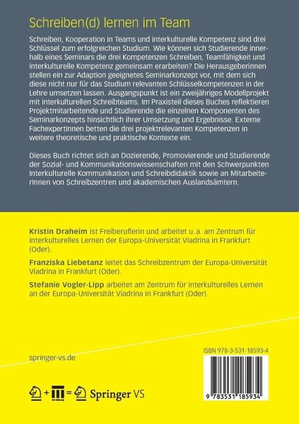 Schreibkompetenz.- Teamkompetenz.- Interkulturelle Kompetenz.- Beispiele der Verknüpfung von Teamarbeit, interkulturellem Lernen und Schreibdidaktik.- Das gesamte Seminar.- Auftaktexkursion.- Schreibteamarbeit.- Lehrveranstaltung zum wissenschaftlichen Schreiben.- Präsentationsworkshop.- Projektergebnisse und Ausblick.