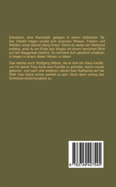 Erlenbach, eine Kleinstadt, gelegen in einem idyllischen Tal. Der Ortsteil Hagen windet sich zwischen Wiesen, Feldern und Wäldern einen kleinen Berg hinauf. Gehst du weiter am Wald-rand entlang, wirst du am Ende des Weges mit einem herrlichen Blick auf den Baggersee be-lohnt. Du könntest dich glücklich schätzen, in Hagen in einem dieser Häuser zu leben. Das dachte auch Wolfgang Bittner, als er dort ein Haus kaufte, um mit seiner Frau Anne eine Familie zu gründen. Aaron wurde geboren, und nach drei weiteren Jahren kam Katharina auf die Welt. Das Glück schien perfekt zu sein. Doch dann schlug das Schicksal erbarmungslos zu.