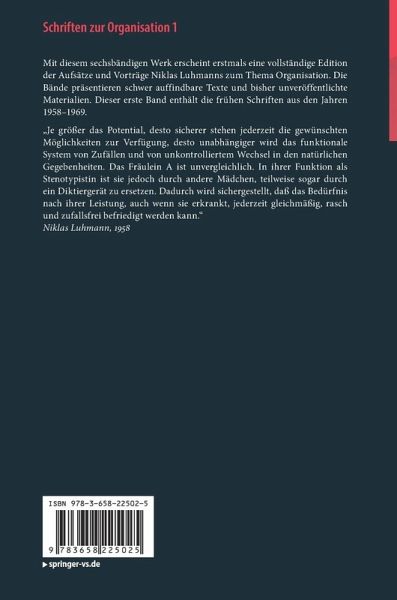 Mit diesem sechsbändigen Werk erscheint erstmals eine vollständige Edition der Aufsätze und Vorträge Niklas Luhmanns zum Thema Organisation. Die Bände präsentieren schwer auffindbare Texte und bisher unveröffentlichte Materialien. Dieser erste Band enthält die frühen Schriften aus den Jahren 1958-1969.