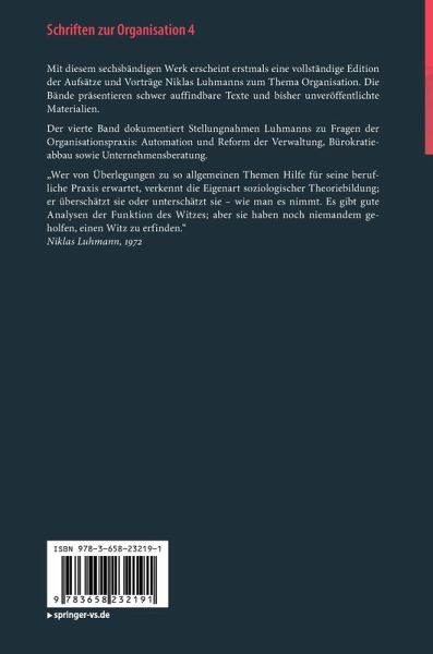 Der vierte Band dokumentiert Stellungnahmen Luhmanns zu Fragen der Organisationspraxis: Automation und Reform der Verwaltung, Bürokratieabbau sowie Unternehmensberatung.