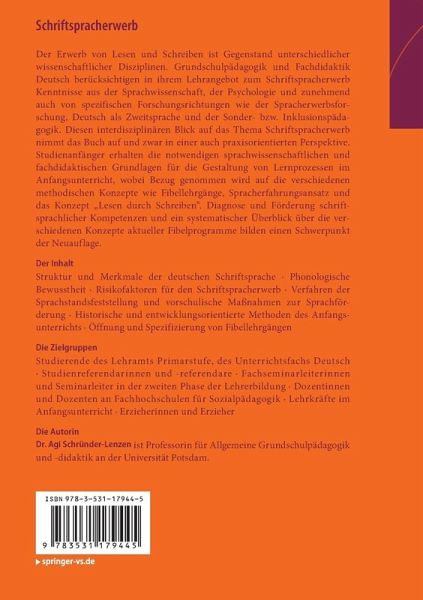 Der Erwerb von Lesen und Schreiben ist Gegenstand unterschiedlicher wissenschaftlicher Disziplinen. Grundschulpädagogik und Fachdidaktik Deutsch berücksichtigen in ihrem Lehrangebot zum Schriftspracherwerb Kenntnisse aus der Sprachwissenschaft, der Psychologie und zunehmend auch von spezifischen Forschungsrichtungen wie der Spracherwerbsforschung, Deutsch als Zweitsprache und der Sonder- bzw. Inklusionspädagogik. Diesen interdisziplinären Blick auf das Thema Schriftspracherwerb nimmt das Buch auf und zwar in einer auch praxisorientierten Perspektive. Studienanfänger erhalten die notwendigen sprachwissenschaftlichen und fachdidaktischen Grundlagen für die Gestaltung von Lernprozessen im Anfangsunterricht, wobei Bezug genommen wird auf die verschiedenen methodischen Konzepte wie Fibellehrgänge, Spracherfahrungsansatz und das Konzept "Lesen durch Schreiben". Diagnose und Förderung schriftsprachlicher Kompetenzen und ein systematischer Überblick über die verschiedenen Konzepte aktueller Fibelprogramme bilden einen Schwerpunkt der Neuauflage.
