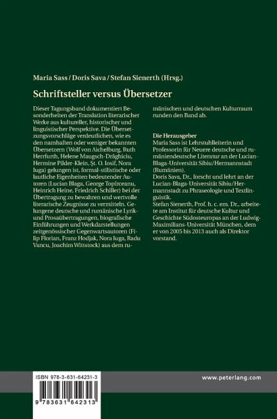 Inhalt: Jürgen Lehman: Formen und Funktion literarischer Übersetzung - Lacramioara Popa: Das Übersetzen von lyrischen Texten oder von der Unübersetzbarkeit der Poesie - Ernest Wichner: «Waren wir denn nicht durch Blut und Schicksal mit ihnen verwandt?» Anstiftung, sich eine mehrsprachige, transnationale jüdische Literatur als Gegenstand der Komparatistik vorzustellen - Horst Schuller: «Grünes Laub am Eichenstamme ...» Bio-bibliografische Lexikon-Daten von Übersetzern rumänischer Volksdichtung - Stefan Sienerth: Eine Festrede und ihre Folgen. Die Übersetzerin Hermine Pilder-Klein im Sichtfeld der Securitate - Maria Sass: Übersetzung und Rezeption. Stefan Octavian Iosif als Vermittler deutscher Dichtung - Nora Capatâna: «Da vergess ich meinen ganzen/widerlichen Alltagskram» - Gedichte von George Topîrceanu in deutscher Übertragung - Cosmin Dragoste: «Des Weges Sinn ist die Sehnsucht/das Heimweh ist der Straße Pfand.» Lucian Blaga in den deutschen Übersetzungen von Ruth Herrfurth und Wolf von Aichelburg - Peter Motzan: Verordnete Weggenossenschaft - eine Schule des Übersetzens? Zur Präsenz rumänischer Gegenwartsliteratur in der Zeitschrift Banater Schrifttum/Neue Literatur (1949-1989) - Doris Sava: Formeln des Überlebens in Absurdistan. Überlegungen zur Übersetzung allusiver Schreibweisen in der Kurzprosa von Stefan M. Gabrian - Ioana Constantin/Carmen Popa: Das Jahr 1556 - der erste deutsche Text der Sitzungsprotokolle des Hermannstädter Magistrats und seine Übersetzung ins Rumänische - Sunhild Galter: Joachim Wittstock versus Nora Iuga - Maria Trappen: Dichten, lektorieren, übersetzen. Einführung in Franz Hodjaks Biografie und Werk - Nora Capatâna: «Die bes-te-al-ler-Wel-ten». Gedichte von Radu Vancu ins Deutsche übersetzt - Rodica-Ofelia Miclea: Filip Florian und die Kunst des Fabulierens.