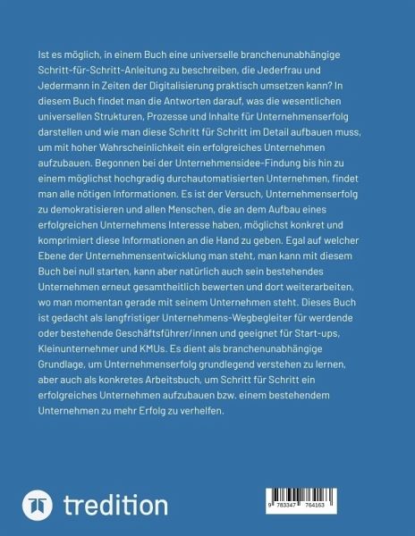 Ist es möglich, in einem Buch eine universelle branchenunabhängige Schritt-für-Schritt-Anleitung zu beschreiben, die Jederfrau und Jedermann in Zeiten der Digitalisierung praktisch umsetzen kann? In diesem Buch findet man die Antworten darauf, was die wesentlichen universellen Strukturen, Prozesse und Inhalte für Unternehmenserfolg darstellen und wie man diese, Schritt für Schritt im Detail aufbauen muss, um mit hoher Wahrscheinlichkeit ein erfolgreiches Unternehmen aufzubauen. Begonnen bei der Unternehmensidee-Findung bis hin zu einem möglichst hochgradig durchautomatisierten Unternehmen, findet man alle nötigen Informationen. Es ist der Versuch, Unternehmenserfolg zu demokratisieren und allen Menschen, die an dem Aufbau eines erfolgreichen Unternehmens Interesse haben, möglichst konkret und komprimiert diese Informationen an die Hand zu geben. Egal auf welcher Ebene der Unternehmensentwicklung man steht, man kann mit diesem Buch bei null starten, kann aber natürlich auch sein bestehendes Unternehmen erneut gesamtheitlich bewerten und dort weiterarbeiten, wo man momentan gerade mit seinem Unternehmen steht. Dieses Buch ist gedacht als langfristiger Unternehmens-Wegbegleiter für werdende oder bestehende Geschäftsführer/innen und geeignet für Start-ups, Kleinunternehmer und KMUs. Es dient als branchenunabhängige Grundlage, um Unternehmenserfolg grundlegend verstehen zu lernen, aber auch als konkretes Arbeitsbuch, um Schritt für Schritt ein erfolgreiches Unternehmen aufzubauen bzw. ein bestehendes Unternehmen zu mehr Erfolg zu verhelfen.