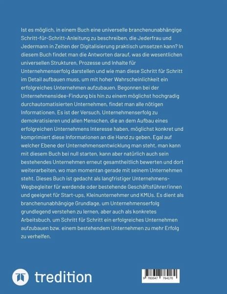 Ist es möglich, in einem Buch eine universelle branchenunabhängige Schritt-für-Schritt-Anleitung zu beschreiben, die Jederfrau und Jedermann in Zeiten der Digitalisierung praktisch umsetzen kann? In diesem Buch findet man die Antworten darauf, was die wesentlichen universellen Strukturen, Prozesse und Inhalte für Unternehmenserfolg darstellen und wie man diese, Schritt für Schritt im Detail aufbauen muss, um mit hoher Wahrscheinlichkeit ein erfolgreiches Unternehmen aufzubauen. Begonnen bei der Unternehmensidee-Findung bis hin zu einem möglichst hochgradig durchautomatisierten Unternehmen, findet man alle nötigen Informationen. Es ist der Versuch, Unternehmenserfolg zu demokratisieren und allen Menschen, die an dem Aufbau eines erfolgreichen Unternehmens Interesse haben, möglichst konkret und komprimiert diese Informationen an die Hand zu geben. Egal auf welcher Ebene der Unternehmensentwicklung man steht, man kann mit diesem Buch bei null starten, kann aber natürlich auch sein bestehendes Unternehmen erneut gesamtheitlich bewerten und dort weiterarbeiten, wo man momentan gerade mit seinem Unternehmen steht. Dieses Buch ist gedacht als langfristiger Unternehmens-Wegbegleiter für werdende oder bestehende Geschäftsführer/innen und geeignet für Start-ups, Kleinunternehmer und KMUs. Es dient als branchenunabhängige Grundlage, um Unternehmenserfolg grundlegend verstehen zu lernen, aber auch als konkretes Arbeitsbuch, um Schritt für Schritt ein erfolgreiches Unternehmen aufzubauen bzw. ein bestehendes Unternehmen zu mehr Erfolg zu verhelfen.
