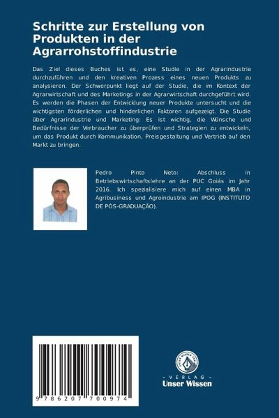 Das Ziel dieses Buches ist es, eine Studie in der Agrarindustrie durchzuführen und den kreativen Prozess eines neuen Produkts zu analysieren. Der Schwerpunkt liegt auf der Studie, die im Kontext der Agrarwirtschaft und des Marketings in der Agrarwirtschaft durchgeführt wird. Es werden die Phasen der Entwicklung neuer Produkte untersucht und die wichtigsten förderlichen und hinderlichen Faktoren aufgezeigt. Die Studie über Agrarindustrie und Marketing: Es ist wichtig, die Wünsche und Bedürfnisse der Verbraucher zu überprüfen und Strategien zu entwickeln, um das Produkt durch Kommunikation, Preisgestaltung und Vertrieb auf den Markt zu bringen.