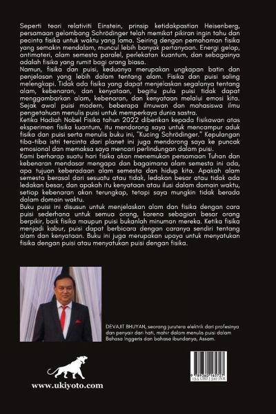 Seperti teori relativiti Einstein, prinsip ketidakpastian Heisenberg, persamaan gelombang Schrödinger telah memikat pikiran ingin tahu dan pecinta fisika untuk waktu yang lama. Seiring dengan pemahaman fisika yang semakin mendalam, muncul lebih banyak pertanyaan. Energi gelap, antimateri, alam semesta paralel, perlekatan kuantum, dan sebagainya adalah fisika yang rumit bagi orang biasa. Namun, fisika dan puisi, keduanya merupakan ungkapan batin dan penjelasan yang lebih dalam tentang alam. Fisika dan puisi saling melengkapi. Tidak ada fisika yang dapat menjelaskan segalanya tentang alam, kebenaran, dan kenyataan, begitu pula puisi tidak dapat menggambarkan alam, kebenaran, dan kenyataan melalui emosi kita. Sejak awal puisi modern, beberapa ilmuwan dan mahasiswa ilmu pengetahuan menulis puisi untuk memperkaya dunia sastra. Ketika Hadiah Nobel Fisika tahun 2022 diberikan kepada fisikawan atas eksperimen fisika kuantum, itu mendorong saya untuk mencampur aduk fisika dan puisi serta menulis buku ini, "Kucing Schrödinger." Kepulangan tiba-tiba istri tercinta dari planet ini juga mendorong saya ke puncak emosional dan memaksa saya mencari perlindungan dalam puisi. Kami berharap suatu hari fisika akan menemukan persamaan Tuhan dan kebenaran mendasar mengapa dan bagaimana alam semesta ini ada, apa tujuan keberadaan alam semesta dan hidup kita. Apakah alam semesta berasal dari sesuatu atau tidak, ledakan besar atau tidak ada ledakan besar, dan apakah itu kenyataan atau ilusi dalam domain waktu, setiap kebenaran akan terungkap, tetapi saya mungkin tidak berada dalam domain waktu. Buku puisi ini disusun untuk menjelaskan alam dan fisika dengan cara puisi sederhana untuk semua orang, karena sebagian besar orang berpikir, baik fisika maupun puisi bukanlah minuman mereka. Ketika fisika menjadi kabur, puisi dapat berbicara dengan caranya sendiri tentang alam dan kenyataan. Buku ini juga merupakan upaya untuk menyatukan fisika dengan puisi atau menyatukan puisi dengan fisika.