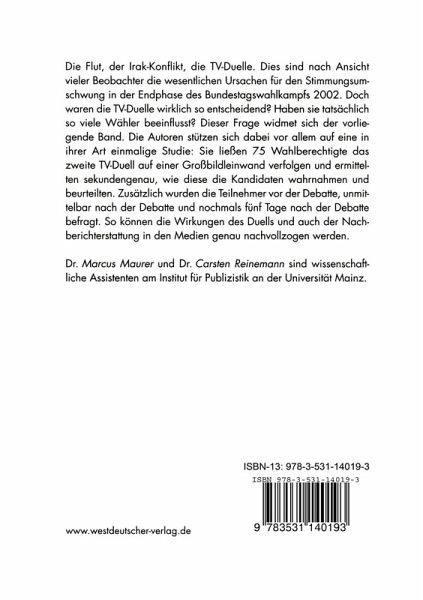 Die Flut, der Irak-Konflikt, die TV-Duelle. Dies sind nach Ansicht vieler Beobachter die wesentlichen Ursachen für den Stimmungsumschwung in der Endphase des Bundestagswahlkampfs 2002. Doch waren die TV-Duelle wirklich so entscheidend? Haben sie tatsächlich so viele Wähler beeinflusst? Dieser Frage widmet sich der vorliegende Band. Die Autoren stützen sich dabei vor allem auf eine in ihrer Art einmalige Studie: Sie ließen 75 Wahlberechtigte das zweite TV-Duell auf einer Großbildleinwand verfolgen und ermittelten sekundengenau, wie diese die Kandidaten wahrnahmen und beurteilten. Zusätzlich wurden die Teilnehmer vor der Debatte, unmittelbar nach der Debatte und nochmals fünf Tage nach der Debatte befragt. So können die Wirkungen der Debatte und auch der Nachberichterstattung in den Medien genau nachvollzogen werden.