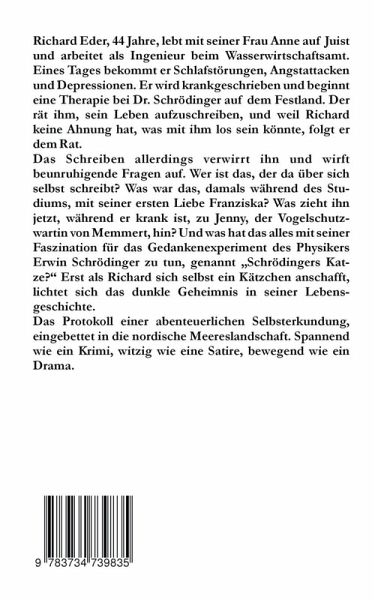 Richard Eder, 44 Jahre, lebt mir seiner Frau Anne auf Juist und arbeitet als Ingenieur beim Wasserwirtschaftsamt. Eines Tages bekommt er Schlafstörungen, Angstattacken und Depressionen. Er wird krankgeschrieben und beginnt eine Therapie bei Dr. Schrödinger auf dem Festland. Der rät ihm, sein Leben aufzuschreiben, und weil Richard keine Ahnung hat, was mit ihm los sein könnte, folgt er dem Rat.Das Schreiben allerdings verwirrt ihn und wirft beunruhigende Fragen auf. Wer ist das, der da über sich selbst schreibt? Was war das, damals während des Studiums, mit seiner ersten Liebe Franziska? Was zieht ihn jetzt, während er krank ist, zu Jenny, der Vogelschutzwartin von Memmert, hin? Und was hat das alles mit seiner Faszination für das Gedankenexperiment des Physikers Erwin Schrödinger zu tun, genannt "Schrödingers Katze?" Erst als Richard sich selbst ein Kätzchen anschafft, lichtet sich das dunkle Geheimnis in seiner Lebensgeschichte.Das Protokoll einer abenteuerlichen Selbsterkundung, eingebettet in die nordische Meereslandschaft. Spannend wie ein Krimi, witzig wie eine Satire, bewegend wie ein Drama.