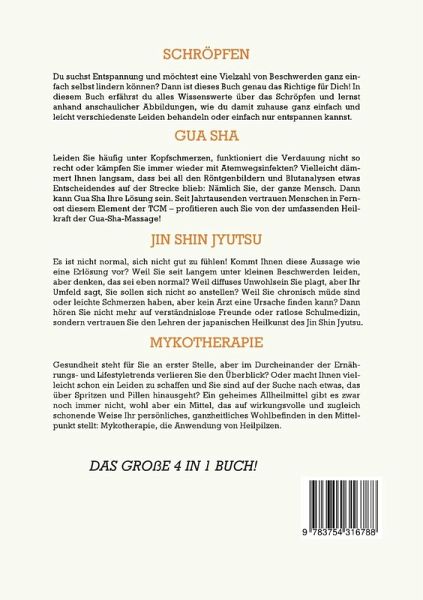 SCHRÖPFENDu suchst Entspannung und möchtest eine Vielzahl von Beschwerden ganz einfach selbst lindern können? Dann ist dieses Buch genau das Richtige für Dich! In diesem Buch erfährst du alles Wissenswerte über das Schröpfen und lernst anhand anschaulicher Abbildungen, wie du damit zuhause ganz einfach und leicht verschiedenste Leiden behandeln oder einfach nur entspannen kannst.GUA SHALeiden Sie häufig unter Kopfschmerzen, funktioniert die Verdauung nicht so recht oder kämpfen Sie immer wieder mit Atemwegsinfekten? Vielleicht dämmert Ihnen langsam, dass bei all den Röntgenbildern und Blutanalysen etwas Entscheidendes auf der Strecke blieb: Nämlich Sie, der ganze Mensch. Dann kann Gua Sha Ihre Lösung sein. Seit Jahrtausenden vertrauen Menschen in Fernost diesem Element der TCM - profitieren auch Sie von der umfassenden Heilkraft der Gua-Sha-Massage! JIN SHIN JYUTSUEs ist nicht normal, sich nicht gut zu fühlen! Kommt Ihnen diese Aussage wie eine Erlösung vor? Weil Sie seit Langem unter kleinen Beschwerden leiden, aber denken, das sei eben normal? Weil diffuses Unwohlsein Sie plagt, aber Ihr Umfeld sagt, Sie sollen sich nicht so anstellen? Weil Sie chronisch müde sind oder leichte Schmerzen haben, aber kein Arzt eine Ursache finden kann? Dann hören Sie nicht mehr auf verständnislose Freunde oder ratlose Schulmedizin, sondern vertrauen Sie den Lehren der japanischen Heilkunst des Jin Shin Jyutsu.MYKOTHERAPIEGesundheit steht für Sie an erster Stelle, aber im Durcheinander der Ernährungs- und Lifestyletrends verlieren Sie den Überblick? Oder macht Ihnen vielleicht schon ein Leiden zu schaffen und Sie sind auf der Suche nach etwas, das über Spritzen und Pillen hinausgeht? Ein geheimes Allheilmittel gibt es zwar noch immer nicht, wohl aber ein Mittel, das auf wirkungsvolle und zugleich schonende Weise Ihr persönliches, ganzheitliches Wohlbefinden in den Mittelpunkt stellt: Mykotherapie, die Anwendung von Heilpilzen.