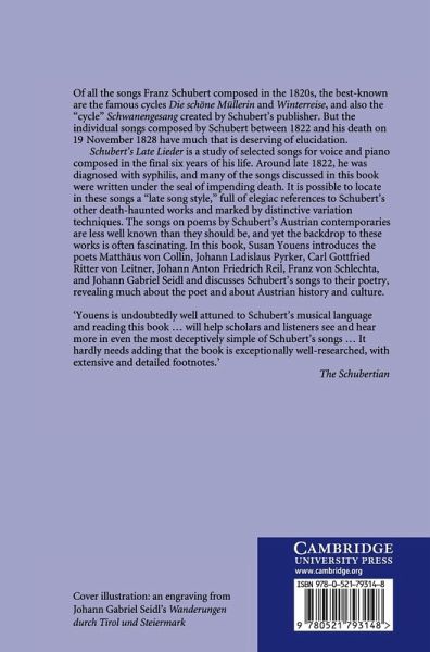 Schubert's Late Lieder is a study of selected songs for voice and piano composed by Schubert between 1822 and his death on 19 November 1828. Circa late 1822, Schubert was diagnosed with syphilis, and many of the songs discussed in this book were written under the seal of impending death. It is possible to locate in these songs a 'late song style', full of elegiac references to Schubert's other death-haunted works and marked by distinctive variation techniques. The songs on poems by Schubert's Austrian contemporaries are less well known than they should be, and yet the backdrop to these works is often fascinating. In this book, Susan Youens introduces the poets Matthäus von Collin, Johann Ladislaus Pyrker, Carl Gottfried Ritter von Leitner, Johann Anton Friedrich Reil, Franz von Schlechta, and Johann Gabriel Seidl and discusses Schubert's songs to their poetry, revealing much about the poet and about Austrian history and culture.