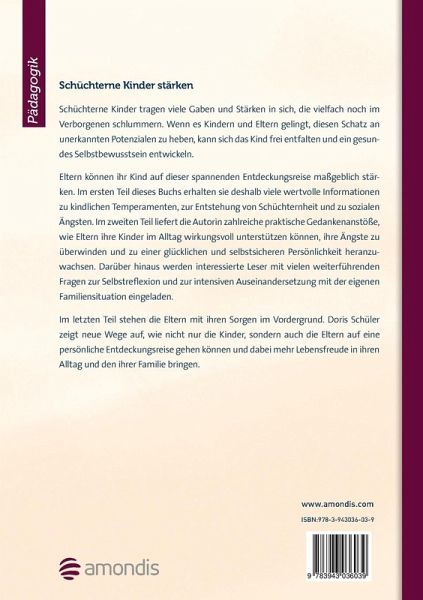 Schüchterne Kinder tragen viele Gaben und Stärken in sich, die vielfach noch im Verborgenen schlummern. Wenn es Kindern und Eltern gelingt, diesen Schatz an unerkannten Potenzialen zu heben, kann sich das Kind frei entfalten und ein gesundes Selbstbewusstsein entwickeln. Eltern können ihr Kind auf dieser spannenden Entdeckungsreise maßgeblich stärken. Im ersten Teil dieses Buchs erhalten sie deshalb viele wertvolle Informationen zu kindlichen Temperamenten, zur Entstehung von Schüchternheit und zu sozialen Ängsten. Im zweiten Teil liefert die Autorin zahlreiche praktische Gedankenanstöße, wie Eltern ihre Kinder im Alltag wirkungsvoll unterstützen können, ihre Ängste zu überwinden und zu einer glücklichen und selbstsicheren Persönlichkeit heranzuwachsen. Darüber hinaus werden interessierte Leser mit vielen weiterführenden Fragen zur Selbstreflexion und zur intensiven Auseinandersetzung mit der eigenen Familiensituation eingeladen. Im letzten Teil stehen die Eltern mit ihren Sorgen im Vordergrund. Doris Schüler zeigt neue Wege auf, wie nicht nur die Kinder, sondern auch die Eltern auf eine persönliche Entdeckungsreise gehen können und dabei mehr Lebensfreude in ihren Alltag und den ihrer Familie bringen.