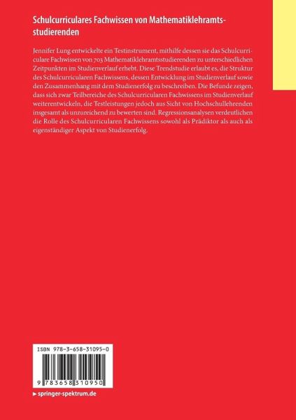 Jennifer Lung entwickelte ein Testinstrument, mithilfe dessen sie das Schulcurriculare Fachwissen von 703 Mathematiklehramtsstudierenden zu unterschiedlichen Zeitpunkten im Studienverlauf erhebt. Diese Trendstudie erlaubt es, die Struktur des Schulcurricularen Fachwissens, dessen Entwicklung im Studienverlauf sowie den Zusammenhang mit dem Studienerfolg zu beschreiben. Die Befunde zeigen, dass sich zwar Teilbereiche des Schulcurricularen Fachwissens im Studienverlauf weiterentwickeln, die Testleistungen jedoch aus Sicht von Hochschullehrenden insgesamt als unzureichend zu bewerten sind. Regressionsanalysen verdeutlichen die Rolle des Schulcurricularen Fachwissens sowohl als Prädiktor als auch als eigenständiger Aspekt von Studienerfolg.