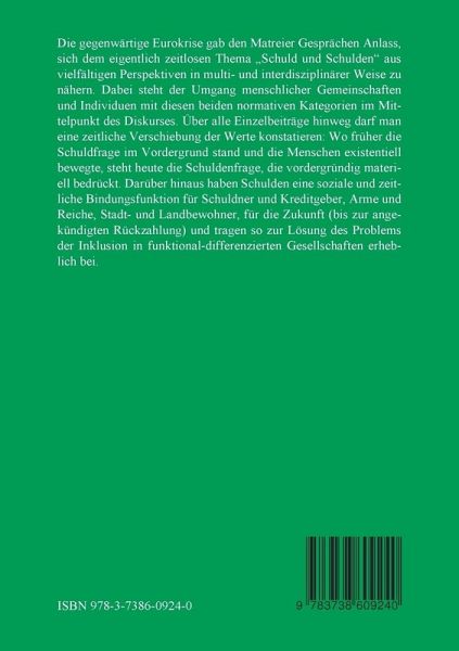 Die gegenwärtige Eurokrise gab den Matreier Gesprächen Anlass, sich dem eigentlich zeitlosen Thema "Schuld und Schulden" aus vielfältigen Perspektiven in multi- und interdisziplinärer Weise zu nähern. Dabei steht der Umgang menschlicher Gemeinschaften und Individuen mit diesen beiden normativen Kategorien im Mittelpunkt des Diskurses. Über alle Einzelbeiträge hinweg darf man eine zeitliche Verschiebung der Werte konstatieren: Wo früher die Schuldfrage im Vordergrund stand und die Menschen existentiell bewegte, steht heute die Schuldenfrage, die vordergründig materiell bedrückt. Darüber hinaus haben Schulden eine soziale und zeitliche Bindungsfunktion für Schuldner und Kreditgeber, Arme und Reiche, Stadt- und Landbewohner, für die Zukunft (bis zur angekündigten Rückzahlung) und tragen so zur Lösung des Problems der Inklusion in funktional-differenzierten Gesellschaften erheblich bei.