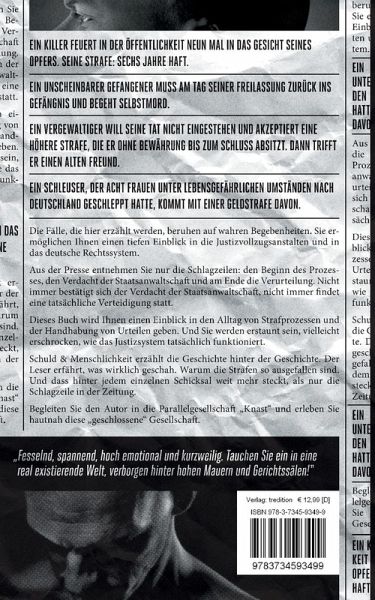 Die Fälle, die hier erzählt werden, beruhen auf wahren Begebenheiten. Sie ermöglichen Ihnen einen tiefen Einblick in die Justizvollzugsanstalten und in das deutsche Rechtssystem. Ein Killer feuert in der Öffentlichkeit neun Mal in das Gesicht seines Opfers. Seine Strafe: sechs Jahre Haft.Ein unscheinbarer Gefangener muss am Tag seiner Freilassung zurück ins Gefängnis und begeht Selbstmord.Ein Vergewaltiger will seine Tat nicht eingestehen und akzeptiert eine höhere Strafe, die er ohne Bewährung bis zum Schluss absitzt. Dann trifft er einen alten Freund.Ein Schleuser, der acht Frauen unter lebensgefährlichen Umständen nach Deutschland geschleppt hatte, kommt mit einer Geldstrafe davon.Aus der Presse entnehmen Sie nur die Schlagzeilen: den Beginn des Prozesses, den Verdacht der Staatsanwaltschaft und am Ende die Verurteilung. Nicht immer bestätigt sich der Verdacht der Staatsanwaltschaft, nicht immer findet eine tatsächliche Verteidigung statt. Dieses Buch wird Ihnen einen Einblickin den Alltag von Strafprozessen und der Handhabung von Urteilen geben. Und Sie werden erstaunt sein, vielleicht erschrocken, wie das Justizsystem tatsächlich funktioniert.Schuld & Menschlichkeit erzählt die Geschichte hinter der Geschichte. Der Leser erfährt, was wirklich geschah. Warum die Strafen so ausgefallen sind. Und dass hinter jedem einzelnen Schicksal weit mehr steckt, als nur die Schlagzeile in der Zeitung. Begleiten Sie den Autor in die Parallelgesellschaft "Knast" und erleben Sie hautnah diese "geschlossene" Gesellschaft."Fesselnd, spannend, hoch emotional und kurzweilig. Tauchen Sie ein in eine real existierende Welt, verborgen hinter hohen Mauern und Gerichtssälen!"