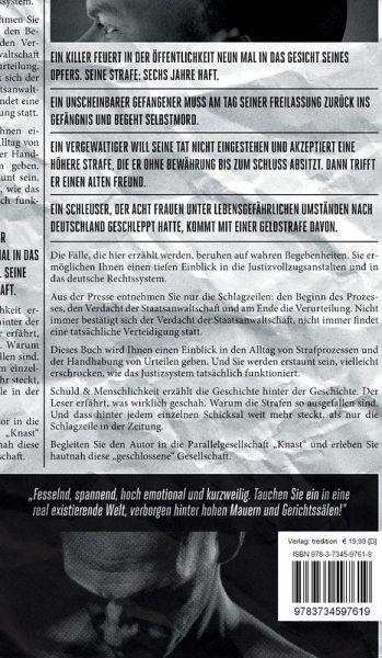 Die Fälle, die hier erzählt werden, beruhen auf wahren Begebenheiten. Sie ermöglichen Ihnen einen tiefen Einblick in die Justizvollzugsanstalten und in das deutsche Rechtssystem. Ein Killer feuert in der Öffentlichkeit neun Mal in das Gesicht seines Opfers. Seine Strafe: sechs Jahre Haft.Ein unscheinbarer Gefangener muss am Tag seiner Freilassung zurück ins Gefängnis und begeht Selbstmord.Ein Vergewaltiger will seine Tat nicht eingestehen und akzeptiert eine höhere Strafe, die er ohne Bewährung bis zum Schluss absitzt. Dann trifft er einen alten Freund.Ein Schleuser, der acht Frauen unter lebensgefährlichen Umständen nach Deutschland geschleppt hatte, kommt mit einer Geldstrafe davon.Aus der Presse entnehmen Sie nur die Schlagzeilen: den Beginn des Prozesses, den Verdacht der Staatsanwaltschaft und am Ende die Verurteilung. Nicht immer bestätigt sich der Verdacht der Staatsanwaltschaft, nicht immer findet eine tatsächliche Verteidigung statt. Dieses Buch wird Ihnen einen Einblickin den Alltag von Strafprozessen und der Handhabung von Urteilen geben. Und Sie werden erstaunt sein, vielleicht erschrocken, wie das Justizsystem tatsächlich funktioniert.Schuld & Menschlichkeit erzählt die Geschichte hinter der Geschichte. Der Leser erfährt, was wirklich geschah. Warum die Strafen so ausgefallen sind. Und dass hinter jedem einzelnen Schicksal weit mehr steckt, als nur die Schlagzeile in der Zeitung. Begleiten Sie den Autor in die Parallelgesellschaft "Knast" und erleben Sie hautnah diese "geschlossene" Gesellschaft."Fesselnd, spannend, hoch emotional und kurzweilig. Tauchen Sie ein in eine real existierende Welt, verborgen hinter hohen Mauern und Gerichtssälen!"