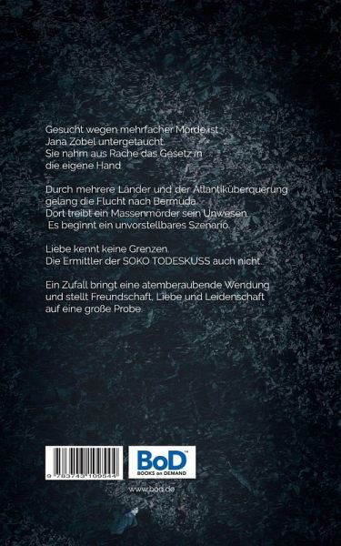Gesucht wegen mehrfacher Morde ist Jana Zobel untergetaucht.Sie nahm aus Rache das Gesetz in die eigeneHand. Durch mehrere Länder und der Atlantiküberquerung gelang die Flucht nach Bermuda. Dort treibt ein Massenmörder sein Unwesen. Es beginnt ein unvorstellbares Szenario.Liebe kennt keine Grenzen.Die Ermittler der SOKO TODESKUSS auch nicht.Ein Zufall bringt eine atemberaubende Wendungund stellt Freundschaft, Liebe und Leidenschaftauf eine große Probe.