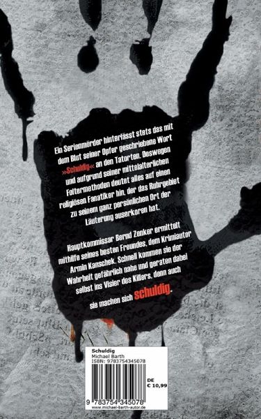 »Schuldig« ist der Relaunch des 2018 veröffentlichen Titels »Henker«. Die Story hat eine komplette Überarbeitung und einige, teils gravierende, Änderungen erfahren. Des Weiteren wurde das Manuskript noch einmal vollständig neu lektoriert. Neben dem Titel ist beispielsweise auch der Ausgang der Geschichte neu. Es lohnt sich also selbst für diejenigen, welche die alte Fassung kennen.Ein Serienmörder hinterlässt stets das mit dem Blut seiner Opfer geschriebene Wort »Schuldig« an den Tatorten. Deswegen und aufgrund seiner mittelalterlichen Foltermethoden deutet alles auf einen religiösen Fanatiker hin, der das Ruhrgebiet zu seinem ganz persönlichen Ort der Läuterung auserkoren hat.Hauptkommissar Bernd Zenker ermittelt mithilfe seines besten Freundes, dem Krimiautor Armin Kanschek. Schnell kommen sie der Wahrheit gefährlich nahe und geraten dabei selbst ins Visier des Killers, denn auch sie machen sich schuldig.