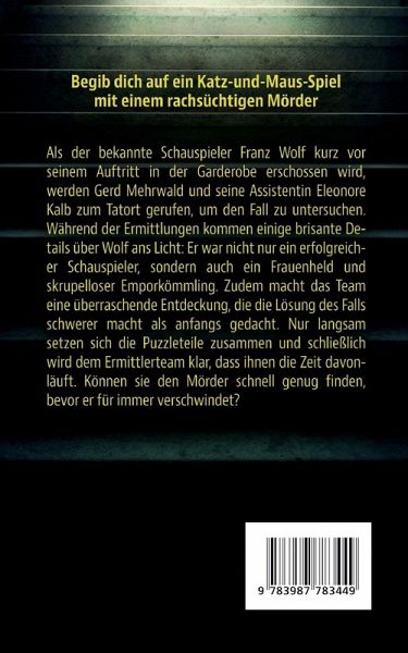 Franz Wolf ist ein bekannter Schauspieler, den man sowohl aus dem Fernsehen als auch vom Theater kennt. Er ist aber auch ein Weiberheld und hat hart und rücksichtslos für seine Karriere gearbeitet. Und Franz Wolf ist tot. Kurz vor einer Premiere im Theater wird er mit einem Kopfschuss in seiner Garderobe gefunden. Die beiden Kommissare Gerd Mehrwald und Eleonore Kalb stehen vor einem schier unlösbaren Rätsel.