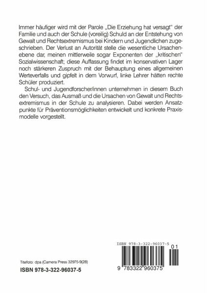 Was ist los an deutschen Schulen, gehen wir auf "amerikanische Ver hältnisse" zu? Nimmt die Gewalt tatsächlich so dramatisch zu, wie die Medienberichterstallung es suggeriert? Woher kommt die Gewalt, wie äußert sie sich und welche Rolle spielt dabei die Schule? Und vor allem: Was kann man dagegen tun? Das sind nur einige Fragen, die gegenwärtig in der öffentlichen Diskus sion eine beachtliche Rolle spielen und die zunehmend auch Eltern, Lehrer und Erzieher bewegen. Die sich in der Gesellschaft artikulieren den Gewalt- und Extremismusphänomene fordern Staat und Wissen schaft zu Stellungnahmen, Analysen und zur Entwicklung von Präven tions-und Interventionsstrategien heraus. Immer häufiger wird derzeit mit der Parole "Die Erziehung hat ver sagt" der Familie und auch der Schule eine (voreilige) Schuld an der Entstehung von Gewalt und Rechtsextremismus bei Kindern und Jugend lichen zugeschrieben. Der Verlust an Autorität stellt die wesentliche Ursachenebene dar, meinen mittlerweile sogar Exponenten der "kriti schen" Sozialwissenschaft; diese Auffassung findet im konservativen Lager noch stärkeren Zuspruch mit der Behauptung eines allgemeinen Werteverfalls und gipfelt in dem Vorwurf, linke Lehrer hätten rechte Schüler produziert.