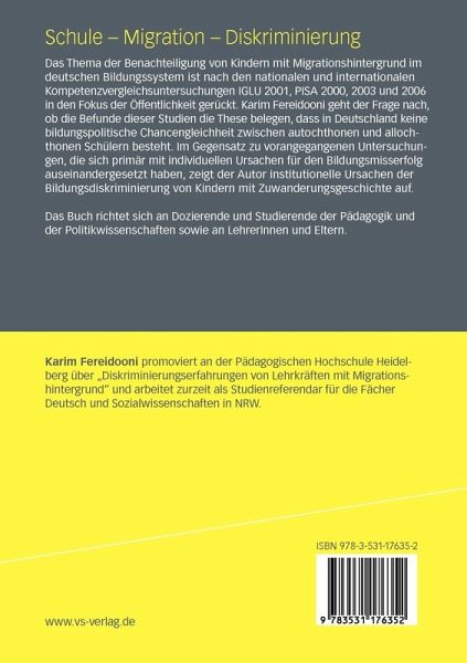 Das Thema der Benachteiligung von Kindern mit Migrationshintergrund im deutschen Bildungssystem ist nach den nationalen und internationalen Kompetenzvergleichsuntersuchungen IGLU 2001, PISA 2000, 2003 und 2006 in den Fokus der Öffentlichkeit gerückt. Karim Fereidooni geht der Frage nach, ob die Befunde dieser Studien die These belegen, dass in Deutschland keine bildungspolitische Chancengleichheit zwischen autochthonen und allochthonen Schülern besteht. Im Gegensatz zu vorangegangenen Untersuchungen, die sich primär mit individuellen Ursachen für den Bildungsmisserfolg auseinandergesetzt haben, zeigt der Autor institutionelle Ursachen der Bildungsdiskriminierung von Kindern mit Zuwanderungsgeschichte auf.
