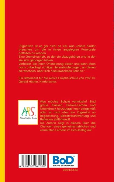 "Eigentlich ist es gar nicht so viel, was unsere Kinder brauchen, um die in ihnen angelegten Potenziale entfalten zu können: Eine Gemeinschaft, zu der sie dazugehören und in der sie sich geborgen fühlen, Vorbilder, die ihnen Orientierung bieten und dann eben noch unbedingt richtige Herausforderungen, an denen sie wachsen, über sich hinauswachsen können."Ein Statement für die Aktive Projekt-Schule von Prof. Dr. Gerald Hüther, Hirnforscher.Was möchte Schule vermitteln? Sind große Klassen, Bulimie-Lernen und Notendruck heutzutage noch zeitgemäß oder ist nicht eher ein Zugewinn an Begeisterung, Selbstverantwortung und Reflexion zielführend?Dieses Buch möchte auf die Chancen eines gemeinschaftlichen, vernetzten und damit nachhaltigen Lernens im Möglichkeitsraum Schule aufmerksam machen, das Kindern und Jugendlichen mehr denn je eigenverantwortliche Herausforderungen ermöglicht und sie hierdurch mehr Freude und Verantwortungsgefühl erfahren lässt.Es beinhaltet ein detailliertes Schulkonzept auf der Grundlage aktueller Bildungs- und Hirnforschung.