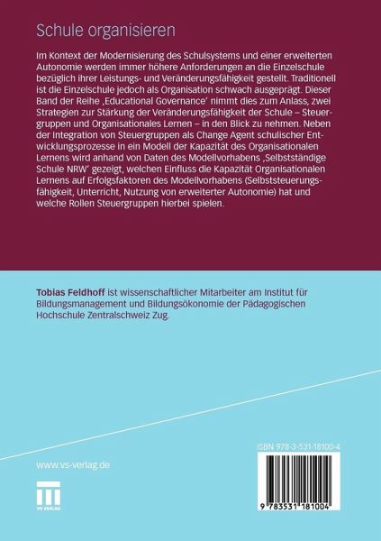 Im Kontext der Modernisierung des Schulsystems und einer erweiterten Autonomie werden immer höhere Anforderungen an die Einzelschule bezüglich ihrer Leistungs- und Veränderungsfähigkeit gestellt. Traditionell ist die Einzelschule jedoch als Organisation schwach ausgeprägt. Dieser Band der Reihe 'Educational Governance' nimmt dies zum Anlass, zwei Strategien zur Stärkung der Veränderungsfähigkeit der Schule - Steuergruppen und Organisationales Lernen - in den Blick zu nehmen. Neben der Integration von Steuergruppen als Change Agent schulischer Entwicklungsprozesse in ein Modell der Kapazität des Organisationalen Lernens wird anhand von Daten des Modellvorhabens 'Selbstständige Schule NRW' gezeigt, welchen Einfluss die Kapazität Organisationalen Lernens auf Erfolgsfaktoren des Modellvorhabens (Selbststeuerungsfähigkeit, Unterricht, Nutzung von erweiterter Autonomie) hat und welche Rollen Steuergruppen hierbei spielen.