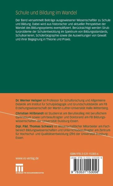 Der Band versammelt Beiträge ausgewiesener Wissenschaftler zu Schule und Bildung. Dabei wird aus historischer und aktueller Perspektive der Wandel des Bildungssystems exemplifiziert. Berücksichtigt werden Strukturprobleme der Schulentwicklung im Spektrum von Bildungsstandards, Schulkarrieren, Schülerbiographie sowie die Auswirkungen von Gewalt und ihrer Begegnung in Theorie und Praxis.