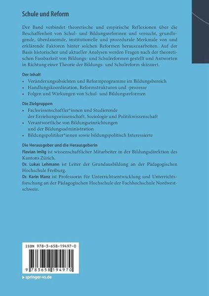 Der Band verbindet theoretische und empirische Reflexionen über die Beschaffenheit von Schul- und Bildungsreformen und versucht, grundlegende, überdauernde, institutionelle und prozedurale Merkmale von und erklärende Faktoren hinter solchen Reformen herauszuarbeiten. Auf der Basis historischer und aktueller Analysen werden Fragen nach der theoretischen Fassbarkeit von Bildungs- und Schulreformen gestellt und Antworten in Richtung einer Theorie der Bildungs- und Schulreform skizziert.