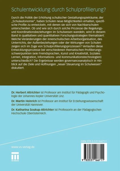 Erweiterung schulischer Gestaltungsspielräume, Schulprofilierung und veränderte Steuerung im Schulwesen - Geschichte und Wirkungslogik der Autonomiepolitik - Schulentwicklung durch Schulprofilierung? - Prozesse, leitende Werte und wahrgenommene Wirkungen von Profilierungsprozessen - Schulinterne Koordinationsmechanismen und Unterrichtsentwicklung - Systemische Koordinationsmechanismen im Mehrebenensystem - 'Profilierung' vs. 'Normalisierung': Unterschiedliche Ausformungen von integrationspädagogischen Arbeitsschwerpunkten - Ergänzende Perspektiven: Was nicht im Schulprofil steht: 'Vorzeigeklassen' und 'Restklassen' an Hauptschulen - Rekrutierung von SchülerInnen und Wirkungen von Profilhauptschulen - Resümee