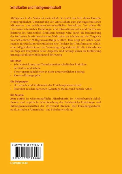 Mittagessen in der Schule ist auch Schule. So lautet das Fazit dieser kamera-ethnographischen Untersuchung von Anna Schütz. zum ganztagsschulischen Mittagessen aus erziehungswissenschaftlicher Perspektive. Vor allem die Dominanz schulischer Handlungs- und Interaktionsmuster und die Formalisierung des vermeintlich familiären Settings wird durch die Beschreibung der konkreten Praxis gemeinsamer Mahlzeiten an Schulen und den Vergleich unterschiedlicher Mittagessenssettings deutlich. Hier zeigt sich neben Spielräumen für peerkulturelle Praktiken eine Tendenz der Transformation schulischer Möglichkeitsräume und Verortungsmöglichkeiten für die AkteurInnen im Zuge der Integration neuer Angebote und Settings durch die Einführung ganztagsschulischer Bildung und Betreuung.