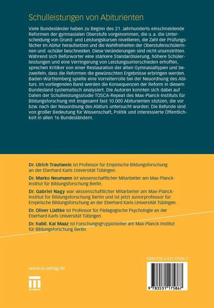 Institutionelle Reform und individuelle Entwicklung: Hintergrund und Fragestellungen der Studie TOSCA-Repeat.- Innovation oder Restauration - Die (Rück-?)Reform der gymnasialen Oberstufe in Baden-Württemberg.- Durchführung und methodische Grundlagen.- Die neu geordnete Oberstufe: Die Sicht von Abiturienten, Eltern, Schul- und Fachleitern.- Schulbiografien, familiärer Hintergrund und kognitive Eingangsvoraussetzungen im Kohortenvergleich.- Voruniversitäre Mathematikleistungen vor und nach der Neuordnung der gymnasialen Oberstufe in Baden-Württemberg.- Fremdsprachenkenntnisse in Englisch vor und nach der Neuordnung der gymnasialen Oberstufe in Baden-Württemberg.- Mathematische und naturwissenschaftliche Grundbildung vor und nach der Neuordnung der gymnasialen Oberstufe in Baden-Württemberg.- Aspekte von Wissenschaftspropädeutik.- Die neu geordnete gymnasiale Oberstufe auf dem Prüfstand: Ein Zwischenresümee.- Psychometrische Aspekte des Tests zu den voruniversitären Mathematikleistungen in TOSCA-2002 und TOSCA-2006: Unterrichtsvalidität, Rasch-Homogenität und Messäquivalenz.