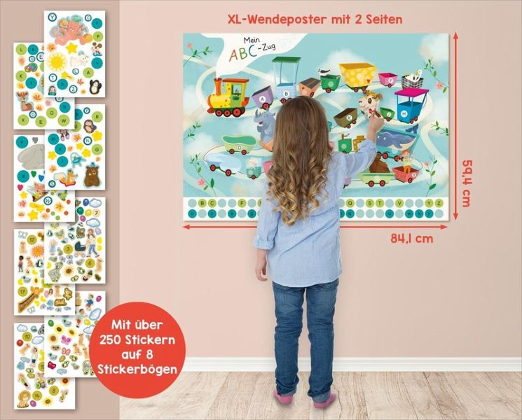 Dieses Produkt kombiniert Stickerspaß mit Lernförderung. Mit über 250 Stickern lassen sich das ABC-Poster und das Plakat zum ersten Zählen gestalten. Das extragroße Wendeposter im DIN-A1-Format lässt hier viel Raum zum Gestalten und Entdecken. Einfach das Poster herausnehmen, Seite auswählen und schon kann losgestickert werden!