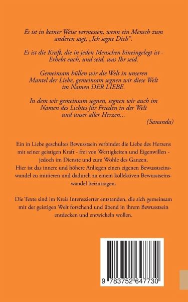 Es ist in keiner Weise vermessen, wenn ein Mensch zum anderen sagt, "Ich segne Dich".Es ist die Kraft, die in jeden Menschen hineingelegt ist -Erhebt euch, und seid, was Ihr seid.Gemeinsam hüllen wir die Welt in unseren Mantel der Liebe, gemeinsam segnen wir diese Welt im Namen DER LIEBE. In dem wir gemeinsam segnen, segnen wir auch im Namen des Lichtes für Frieden in der Welt und unser aller Herzen...(Sananda)Ein in Liebe geschultes Bewusstsein verbindet die Liebe des Herzens mit seiner geistigen Kraft - frei von Wertigkeiten und Eigenwillen - jedoch im Dienste und zum Wohle des Ganzen.Hier ist das innere und höhere Anliegen, einen eigenen Bewusstseinswandel zu initiieren und dadurch zu einem kollektiven Bewusstseinswandel beizutragen.Die Texte sind im Kreis Interessierter entstanden, die sich gemeinsam mit der geistigen Welt forschend und übend in ihrem Bewusstsein entdecken und entwickeln wollen.