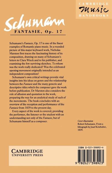 Schumann's Fantasie, Op. 17 is one of the finest examples of Romantic piano music. In a rounded picture of this major keyboard work, Nicholas Marston first traces the fascinating history of its composition, drawing on many of Schumann's letters to Clara Wieck and to his publisher, and examining the few surviving sketches. To whom was the work really dedicated? Was the celebrated opening movement originally intended as an independent composition?