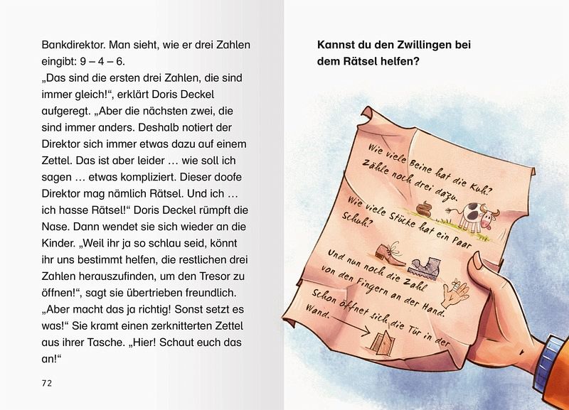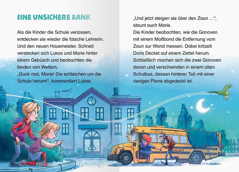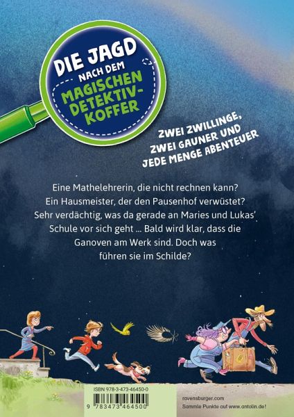 Komisch! Die neue Mathelehrerin von Marie und Lukas, Frau von und zu Schwindel, kann gar nicht rechnen. Und der neue Hausmeister, Herr Besenrein, macht auch einen verdächtigen Eindruck... Moment mal, sind das nicht die beiden Ganoven? Sicher führen sie wieder etwas im Schilde! Und wirklich: Die beiden Schurken planen einen Überfall auf die Bank, die direkt neben der Schule liegt. Ob die Zwillinge ihren Plan vereiteln können? Band 6 der erfolgreichen Detektivreihe.