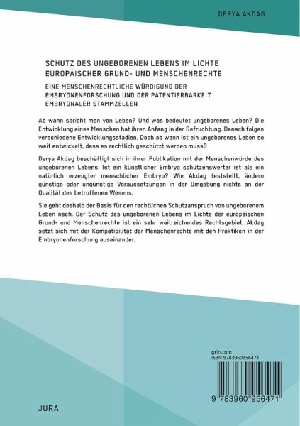 Ab wann spricht man von Leben? Und was bedeutet ungeborenes Leben? Die Entwicklung eines Menschen hat ihren Anfang in der Befruchtung. Danach folgen verschiedene Entwicklungsstadien. Doch ab wann ist ein ungeborenes Leben so weit entwickelt, dass es rechtlich geschützt werden muss?Derya Akdag beschäftigt sich in ihrer Publikation mit der Menschenwürde des ungeborenen Lebens. Ist ein künstlicher Embryo schützenswerter ist als ein natürlich erzeugter menschlicher Embryo? Wie Akdag feststellt, ändern günstige oder ungünstige Voraussetzungen in der Umgebung nichts an der Qualität des betroffenen Wesens.Sie geht deshalb der Basis für den rechtlichen Schutzanspruch von ungeborenem Leben nach. Der Schutz des ungeborenen Lebens im Lichte der europäischen Grund- und Menschenrechte ist ein sehr weitreichendes Rechtsgebiet. Akdag setzt sich mit der Kompatibilität der Menschenrechte mit den Praktiken in der Embryonenforschung auseinander.Aus dem Inhalt:- Stammzellen;- embryonale Stammzellen;- Biomedizin;- Präimplantationsdiagnostik;- Pränataldiagnostik;- Abtreibung