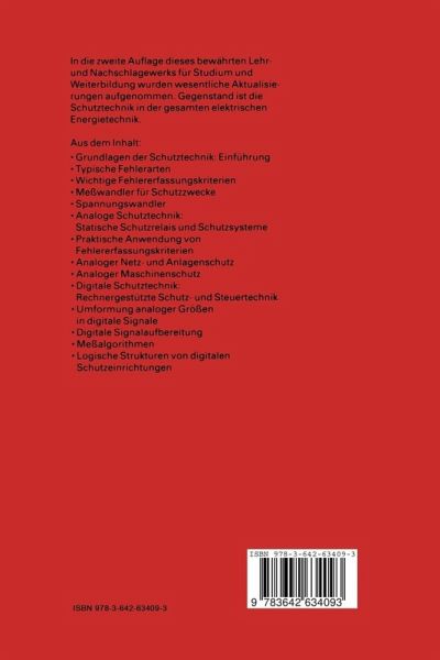 Aus dem Inhalt : Grundlagen der Schutztechnik : Einführung.- Typische Fehlerarten.- Wichtige Fehlererfassungskriterien.- Meßwandler für Schutzzwecke.- Spannungswandler.- Analoge Schutztechnik : Statische Schutzrelais und Schutzsysteme.- Praktische Anwendung von Fehlererfassungskriterien.- Analoger Netz- und Anlagenschutz.- Analoger Maschinenschutz.- Digitale Schutztechnik : Rechnergestützte Schutz- und Steuertechnik.- Umformung analoger Größen in digitale Signale.- Digitale Signalaufbereitung.- Meßalgorithmen.- Logische Strukturen von digitalen Schutzeinrichtungen.
