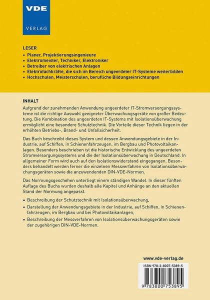 Aufgrund der zunehmenden Anwendung ungeerdeter IT-Stromversorgungssysteme ist die richtige Auswahl geeigneter Überwachungsgeräte von großer Bedeutung. Die Kombination des ungeerdeten IT-Systems mit Isolationsüberwachung ermöglicht eine besondere Schutztechnik. Die Vorteile dieser Technik liegen in der erhöhten Betriebs-, Brand- und Unfallsicherheit.Das Buch beschreibt dieses System und dessen Anwendungsgebiete in der Industrie, auf Schiffen, in Schienenfahrzeugen, im Bergbau und Photovoltaikanlagen. Besonders beschrieben ist die historische Entwicklung des ungeerdeten Stromversorgungssystems und die der Isolationsüberwachung in Deutschland. In allgemeiner Form wird auch auf den Isolationswiderstand eingegangen. Besonders behandelt werden ferner die einzelnen Messverfahren von Isolationsüberwachungsgeräten sowie die anzuwendenden DIN-VDE-Normen.Das Normungsgeschehen unterliegt einem ständigen Wandel. In dieser fünften Auflage des Buchs wurden deshalb alle Kapitel und Anhänge an den aktuellen Stand der Normung angepasst.- Beschreibung der Schutztechnik mit Isolationsüberwachung,- Darstellung der Anwendungsgebiete in der Industrie, auf Schiffen, in Schienenfahrzeugen, im Bergbau und bei Photovoltaikanlagen,- Beschreibung der Messverfahren von Isolationsüberwachungsgeräten sowieder zugehörigen DIN-VDE-Normen.