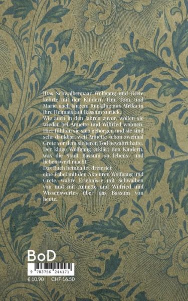 Das Schwalbenpaar Wolfgang und Grete kehrte mit den Kindern Tim, Tom, und Marie nach langem Rückflug aus Afrika in ihre Heimatstadt Bassum zurück.Wie auch in den Jahren zuvor, wollen sie wieder bei Annette und Wilfried wohnen. Hier fühlten sie sich geborgen und sie sind sehr dankbar, weil Annette schon zweimal Grete vor dem sicheren Tod bewahrt hatte.Der kluge Wolfgang erklärt den Kindern, was die Stadt Bassum so lebens- und liebenswert macht.Das Buch beinhaltet dreierlei:eine Fabel mit den Akteuren Wolfgang und Grete, wahre Erlebnisse mit Schwalben von und mit Annette und Wilfried und Wissenswertes über das Bassum von heute.