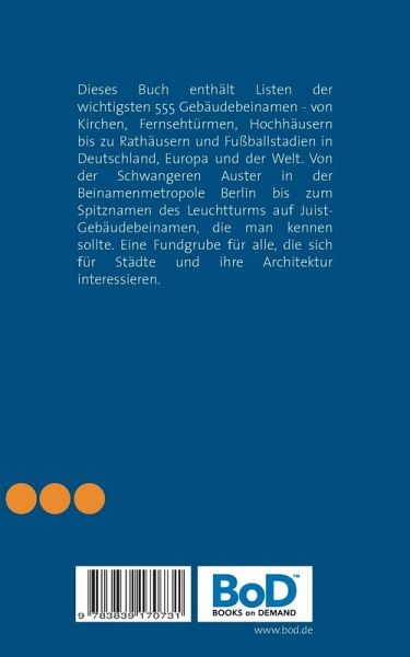 Dieses Buch enthält Listen der wichtigsten 555 Gebäudebeinamen - von Kirchen, Fernsehtürmen, Hochhäusern bis zu Rathâusern und Fußballstadien in Deutschland, Europa und der Welt. Von der Schwangeren Auster in der Beinamenmetropole Berlin bis zum Spitznamen des Leuchtturms auf Juist- Gebäudebeinamen, die man kennen sollte. Eine Fundgrube für alle, die sich für Städte und ihre Architektur interessieren.