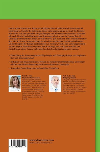 Immer mehr Frauen bzw. Paare verwirklichen ihren Kinderwunsch jenseits des 40. Lebensjahres. Sowohl die Betreuung dieser Schwangerschaften, als auch die Geburtshilfe sehen sich mit speziellen Fragestellungen und Problemen konfrontiert. Dasselbe gilt auch für die Herbeiführung einer Schwangerschaft, wenn die Frauen das 40. Lebensjahr überschritten haben. Nichtdestotrotz gibt es immer mehr werdende Mütter über 40. In diesem Zusammenhang ist mit einer wachsenden Anzahl präexistenter Erkrankungen oder Risikokonstellationen zu rechnen, welche den Schwangerschaftsverlauf negativ beeinflussen können. Die Schwangerenvorsorge muss daher den Bedürfnissen dieser Frauen individuell und risikoadaptiert angepasst werden.