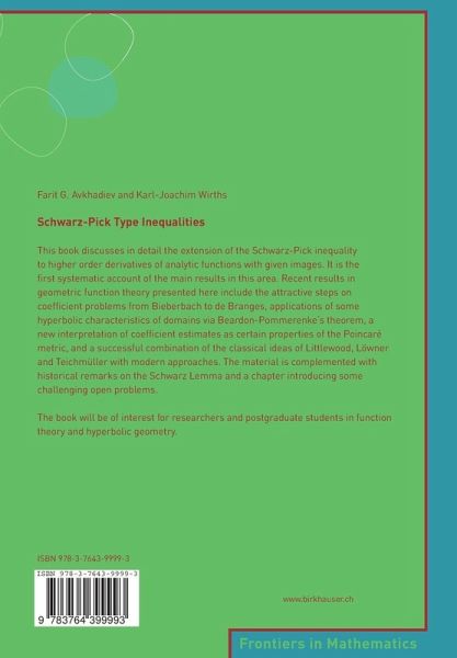 This book discusses in detail the extension of the Schwarz-Pick inequality to higher order derivatives of analytic functions with given images. It is the first systematic account of the main results in this area. Recent results in geometric function theory presented here include the attractive steps on coefficient problems from Bieberbach to de Branges, applications of some hyperbolic characteristics of domains via Beardon-Pommerenke's theorem, a new interpretation of coefficient estimates as certain properties of the Poincaré metric, and a successful combination of the classical ideas of Littlewood, Löwner and Teichmüller with modern approaches. The material is complemented with historical remarks on the Schwarz Lemma and a chapter introducing some challenging open problems.