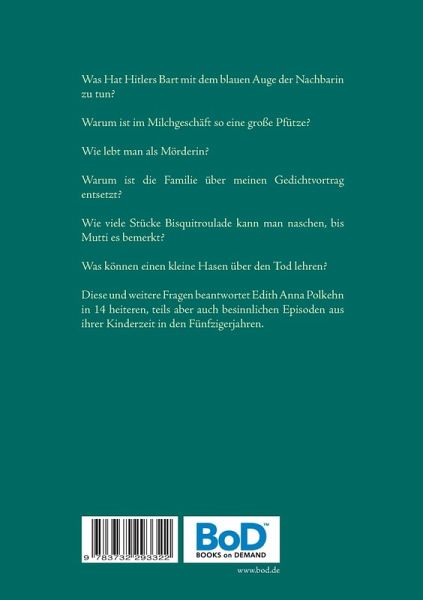 Was Hat Hitlers Bart mit dem blauen Auge der Nachbarin zu tun?Warum ist im Milchgeschäft so eine große Pfütze?Wie lebt man als Mörderin?Warum ist die Familie über meinen Gedichtvortrag entsetzt?Wie viele Stücke Bisquitroulade kann man naschen, bis Mutti es bemerkt?Was können einen kleine Hasen über den Tod lehren?Diese und weitere Fragen beantwortet Edith Anna Polkehn in 14 heiteren, teils aber auch besinnlichen Episoden aus ihrer Kinderzeit in den Fünfzigerjahren.