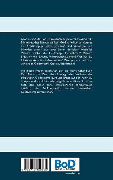 Kann es sein, dass unser Geldsystem gar nicht funktioniert? Stimmt es, dass Banken gar kein Geld verleihen, sondern es bei Kreditvergabe selbst schaffen? Sind Vermögen und Schulden einfach nur zwei Seiten derselben Medaille? Warum wächst die Geldmenge fortwährend? Warum brauchen wir dauernd Wirtschaftswachstum? Was hat die Inflationsrate mit all dem zu tun? Wer gewinnt und wer verliert im Geldsystem? Gibt es Alternativen?Mit diesen Fragen beschäftigt sich die kleine Abhandlung. Der Autor hat Wert darauf gelegt, die Probleme des derzeitigen Geldsystems kurz und knapp auf den Punkt zu bringen und so einfach wie möglich zu erklären. So ist es auch dem Leser ohne entsprechende Vorkenntnisse möglich, die Funktionsweise unseres derzeitigen Geldsystems zu verstehen.