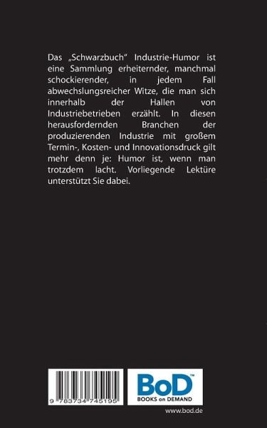 Das "Schwarzbuch" Industrie-Humor ist eine Sammlung erheiternder, manchmal schockierender, in jedem Fall abwechslungsreicher Witze, die man sich innerhalb der Hallen von Industriebetrieben erzählt. In diesen herausfordernden Branchen der produzierenden Industrie mit großem Termin-, Kosten- und Innovationsdruck gilt mehr denn je: Humor ist, wenn man trotzdem lacht. Vorliegende Lektüre unterstützt Sie dabei.
