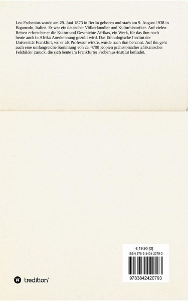 Leo Frobenius wurde am 29. Juni 1873 in Berlin geboren und starb am 9. August 1938 in Biganzolo, Italien. Er war ein deutscher Völkerkundler und Kulturhistoriker. Auf vielen Reisen erforschte er die Kultur und Geschichte Afrikas, ein Werk, für das ihm noch heute auch in Afrika Anerkennung gezollt wird. Das Ethnologische Institut der Universität Frankfurt, wo er als Professor wirkte, wurde nach ihm benannt. Auf ihn geht auch eine umfangreiche Sammlung von ca. 4700 Kopien prähistorischer afrikanischer Felsbilder zurück, die sich heute im Frankfurter Frobenius-Institut befindet.